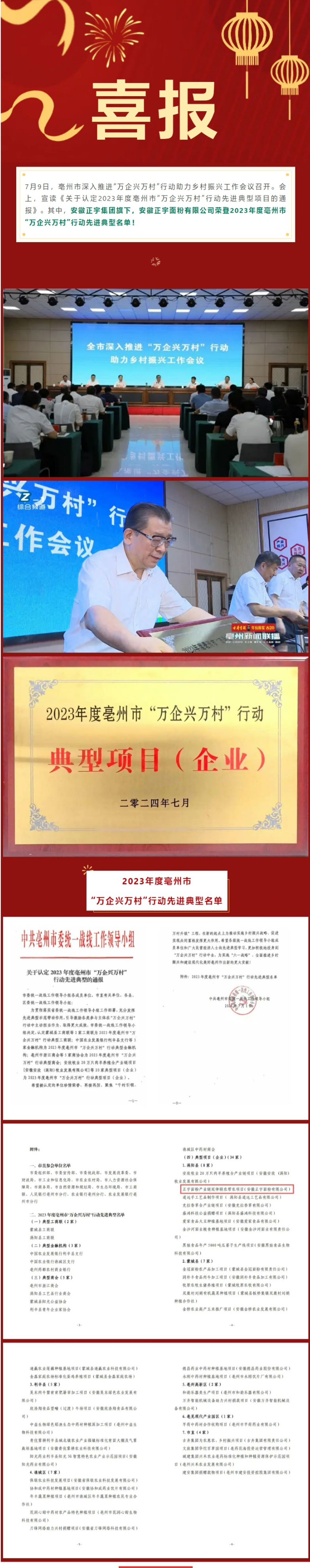 證書+1!安徽正宇面粉有限公司榮登2023年度亳州市“萬企興萬村”行動先進典型名單!