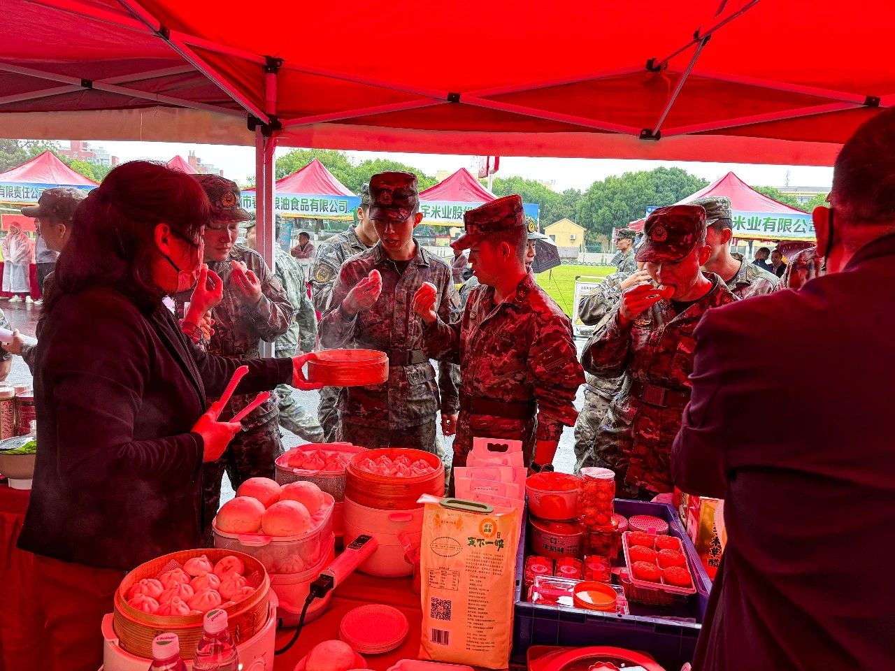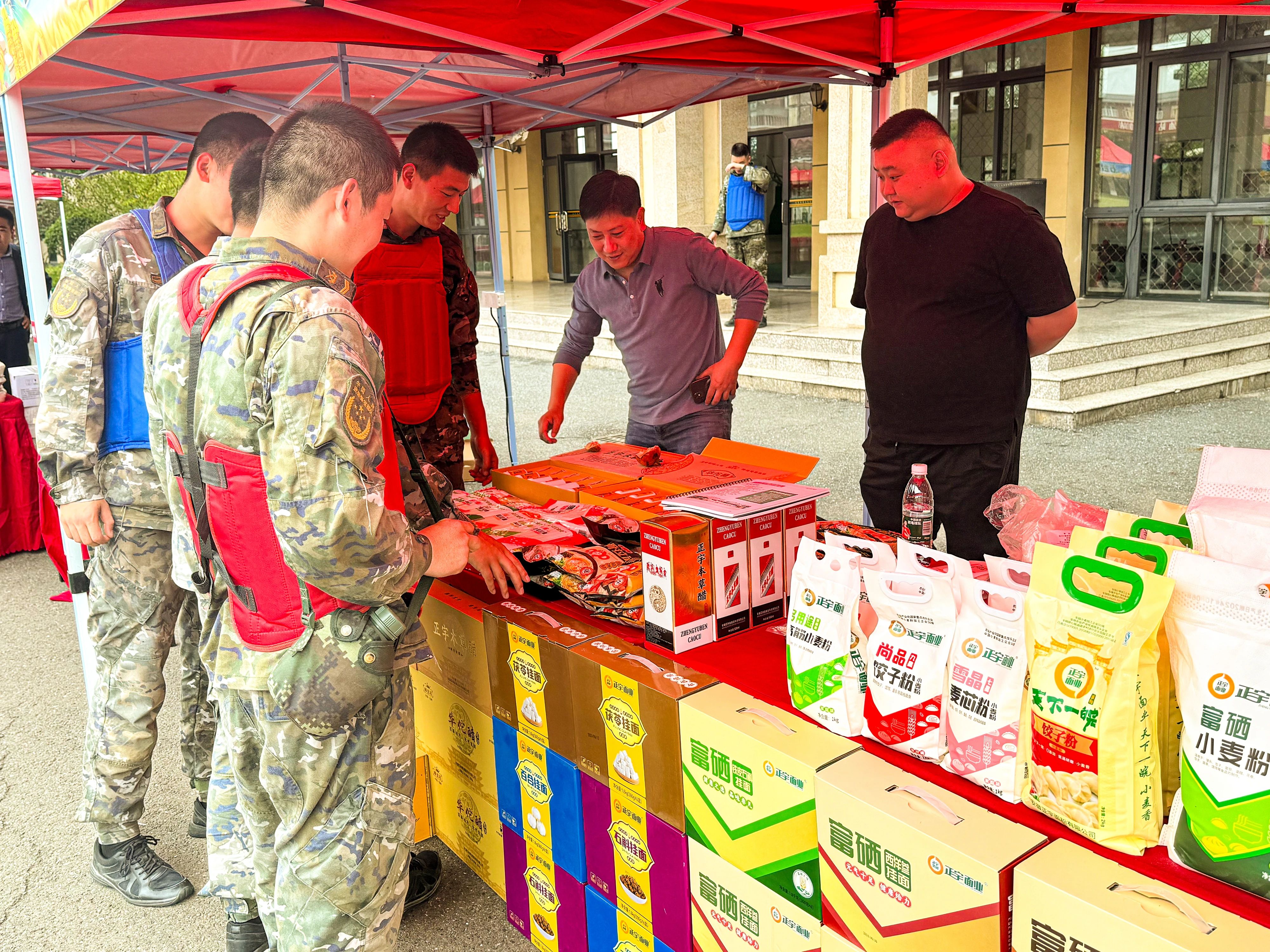 正宇集團展臺前人頭攢動,人民子弟兵們紛紛前來參觀正宇集團獨具特色的富硒面粉、本草醋、非油炸方便食品等產品。同時在品鑒了現場蒸制的包點、餃子之后贊不絕口,對產品的品質、口味等給予了極高的評價。