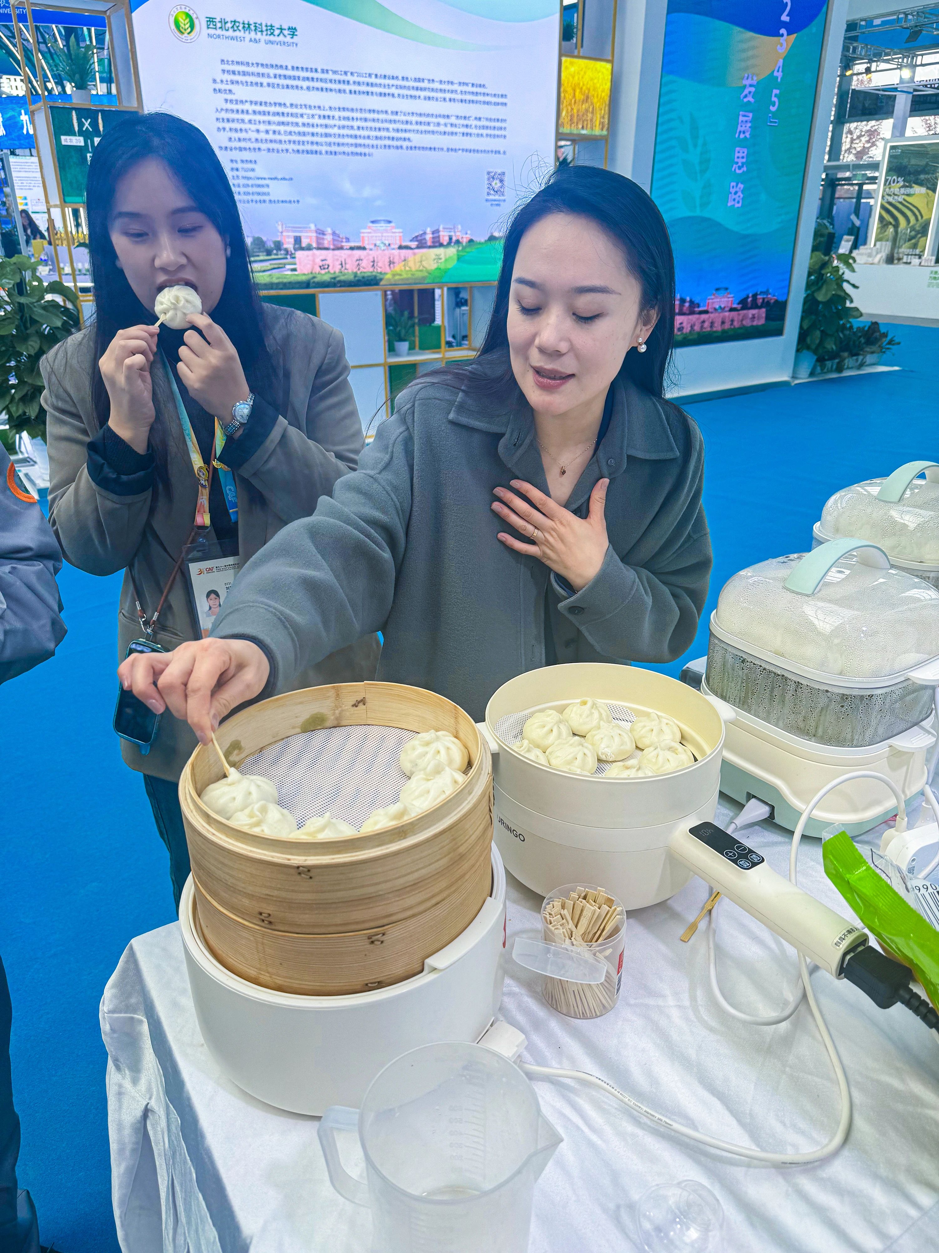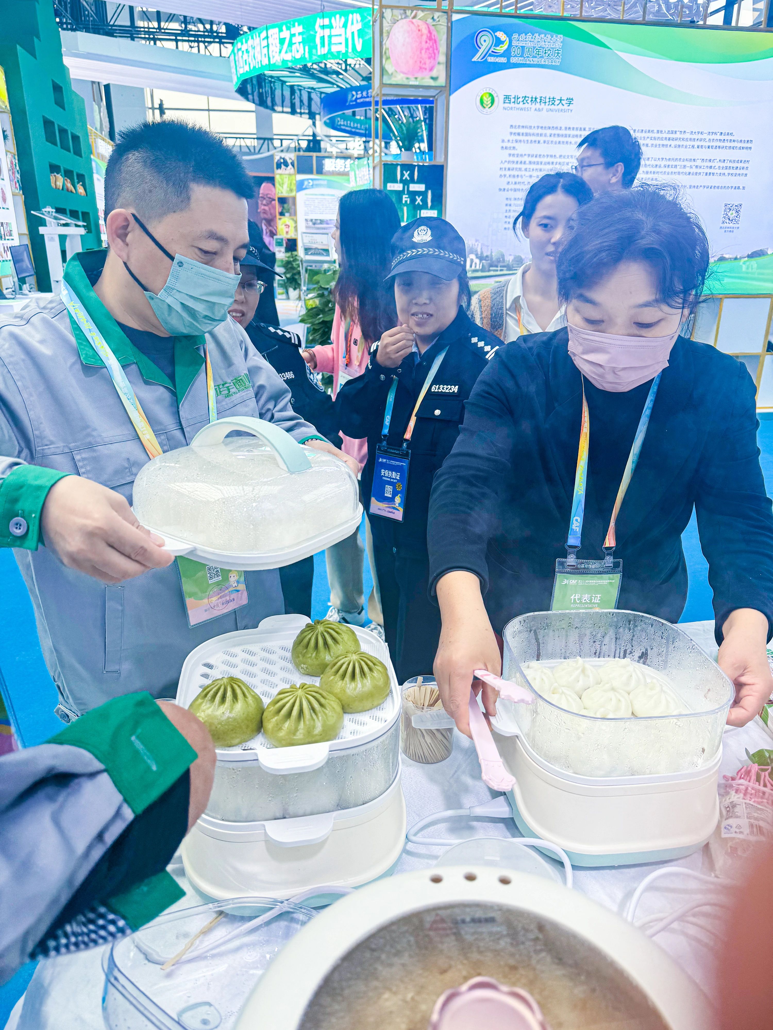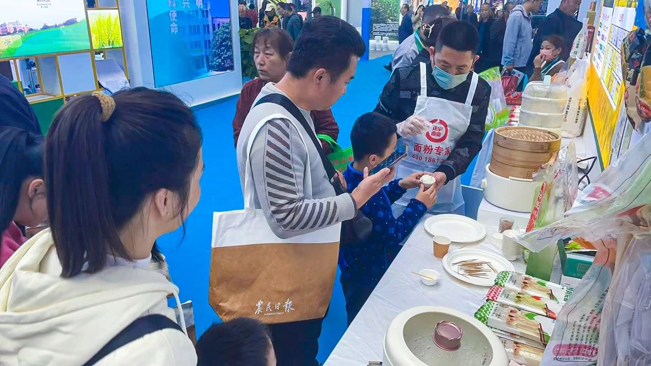 正宇集團展臺前熙熙攘攘,參展觀眾對正宇集團獨具特色的富硒面粉、本草醋、非油炸方便食品等產品表現出了極大的興趣。而在品鑒了現場蒸制的包點、餃子之后更是贊不絕口。