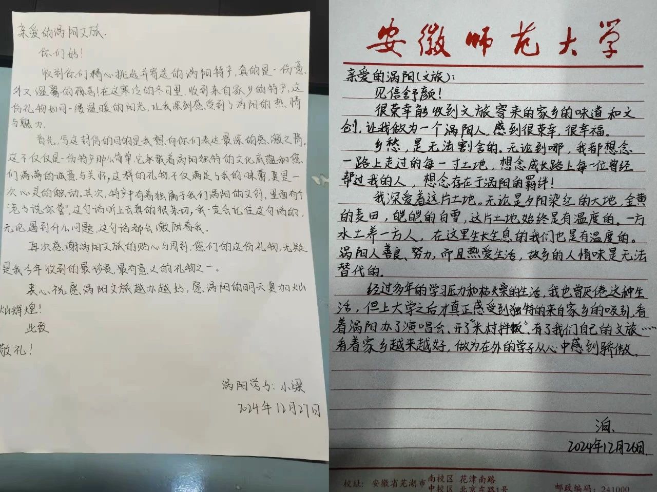 這次特產(chǎn)贈(zèng)送活動(dòng),正宇集團(tuán)為渦陽游子送出了旗下非油炸系列的正宇天下一皖方便面和喜由季干脆面,方便快捷又不失渦陽風(fēng)味特色,為遠(yuǎn)在他鄉(xiāng)的游子們提供了能隨時(shí)品味家鄉(xiāng)味道的便捷選擇。 收到特產(chǎn)的游子們滿心歡喜,紛紛在社交媒體上曬出照片,與廣大網(wǎng)友共同分享這份承載著家鄉(xiāng)記憶的驚喜。 更有許多游子,用筆墨書寫了這份感動(dòng),一張張飽含對(duì)家鄉(xiāng)思念的信紙跨越千山萬水來到渦陽,表達(dá)著他們對(duì)本次活動(dòng)的感謝,同時(shí)為家鄉(xiāng)的發(fā)展送上了誠(chéng)摯的祝福。
