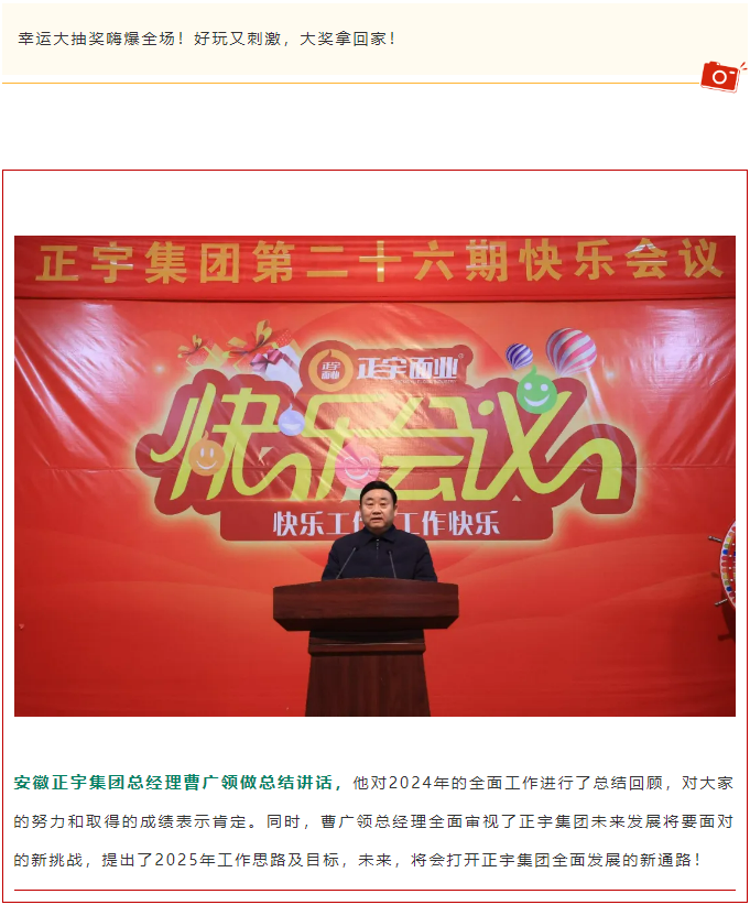 揮別2024,迎接2025,正宇集團(tuán)第二十六期快樂會(huì)議于2025年元旦盛大開幕。全體員工齊聚一堂,共同揮別滿載收獲的 2024 年,滿懷憧憬地迎接充滿希望的 2025 年。本次快樂會(huì)議不僅是對(duì)過去一年工作的總結(jié)與回顧,更是一次凝聚人心、激勵(lì)士氣的盛會(huì),為新的一年奏響了奮進(jìn)的序曲。