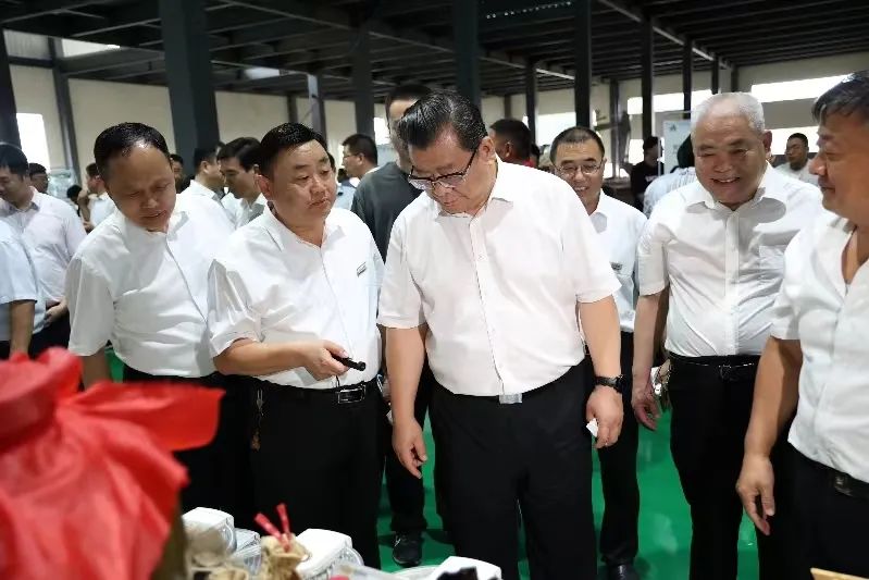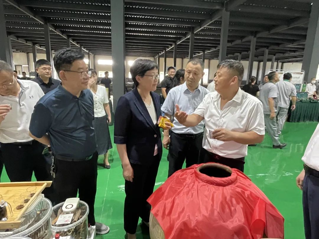 市委書記杜延安、市長秦鳳玉、縣長豐霄寒到安徽百味首食品科技有限公司展區(qū)詢問華佗養(yǎng)生醋企業(yè)情況